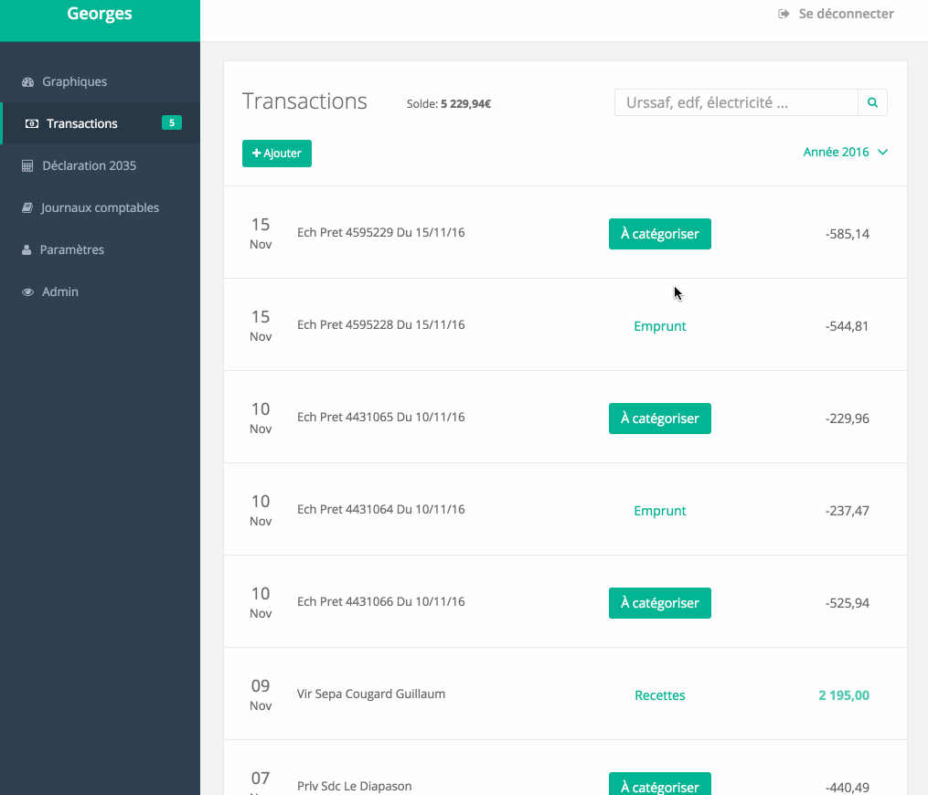 Mieux, Georges (maintenant Indy) sait désormais classer 90% de vos recettes et dépenses automatiquement grâce à son intelligence statistique. Les restaurants, les dépenses récurrentes, les recettes, tout est classé pour vous faire gagner du temps avec une grande fiabilité. Georges (maintenant Indy) vous laisse simplement la main lorsqu’il a un doute en indiquant « à catégoriser ». En 2 clics, vous classez les transactions « à catégoriser » restantes.