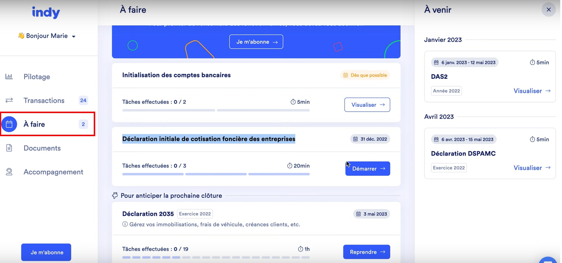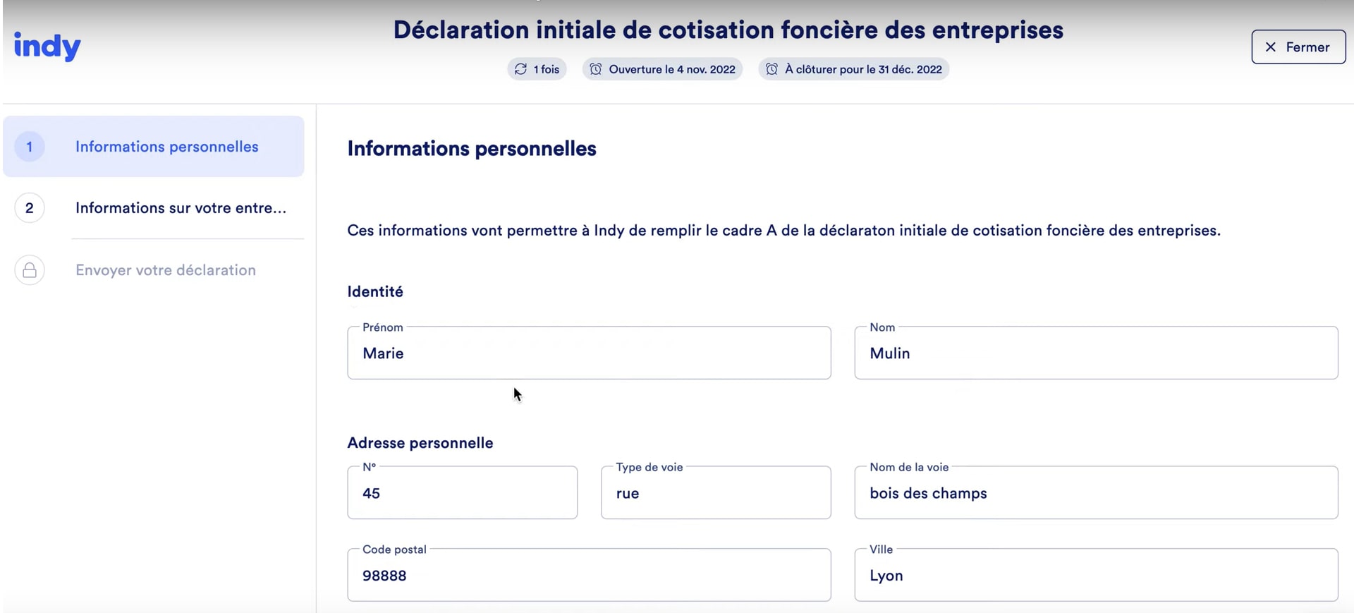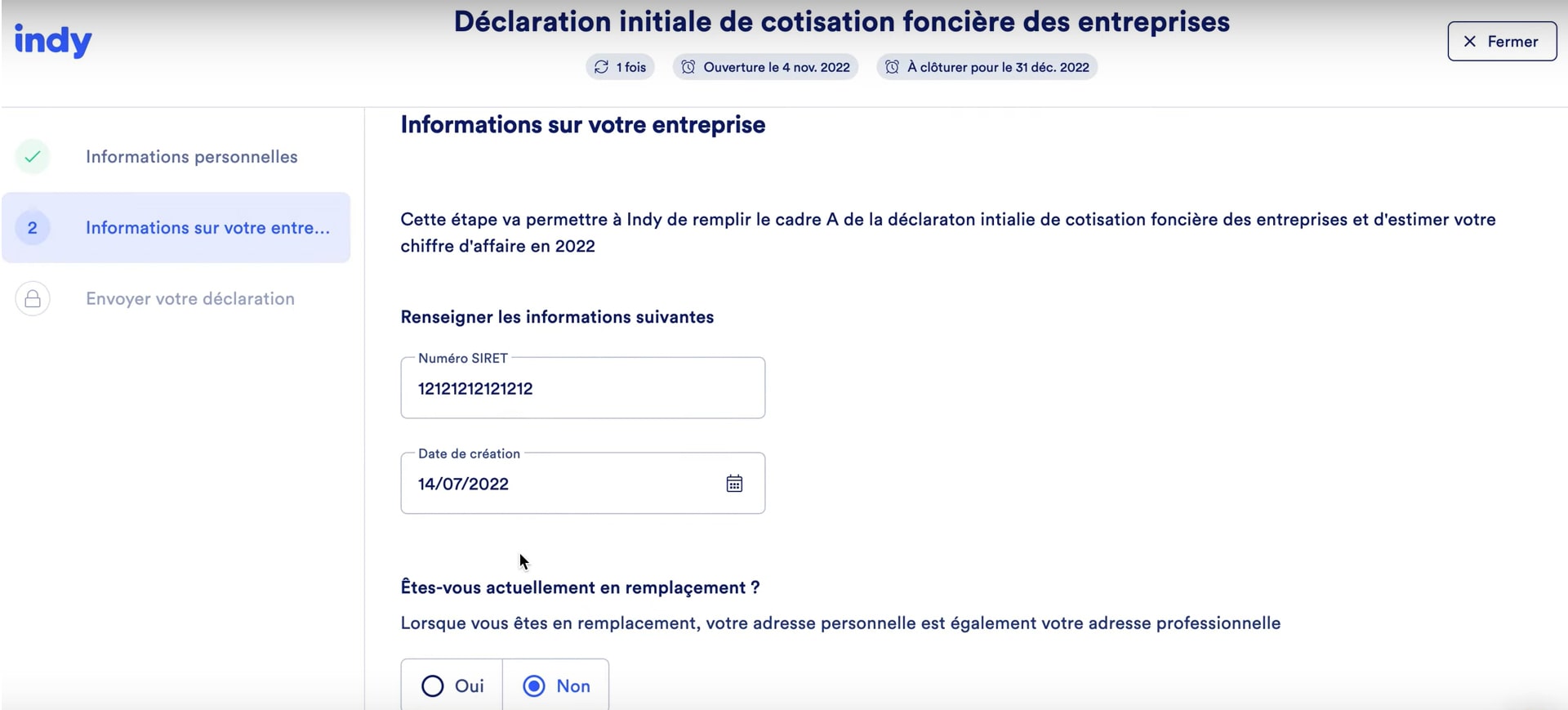 Pour toute personne qui s’inscrit avant la date limite de déclaration, Indy propose une aide au remplissage de la déclaration initiale. La déclaration se fait en 3 ou 4 étapes selon la profession et la forme juridique. Dans l’onglet “A faire” de Indy, sélectionner “Déclaration initiale de Cotisation Foncière des Entreprises”.