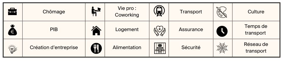 Nous avons volontairement limité notre sélection afin de rendre l’analyse plus claire et pertinente. En effet, l’inclusion d’un trop grand nombre de villes aurait complexifié la comparaison, rendant plus difficile l’identification des villes les mieux adaptées à vos ambitions.