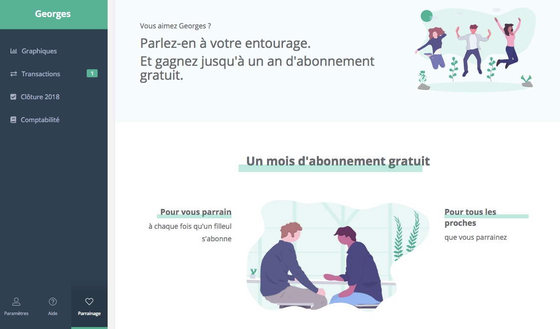 Le parrainage est disponible directement dans votre application Georges (maintenant Indy), en bas dans le menu de gauche. Il remplace l’icône ambassadeur. Sur cette page, vous êtes invité à entrer le mail de vos amis, collègues, famille à qui vous souhaitez faire découvrir Georges (maintenant Indy) pour leur permettre de réaliser leur comptabilité en un temps record ! Si votre futur filleul s’abonne, vous bénéficiez tous les deux d’un mois offert. Simple comme bonjour. Vous aviez déjà recommandé Georges (maintenant Indy) ? Si vous êtes passé par l’ancienne page “Ambassadeur”, vous bénéficiez aussi d’un mois gratuit pour vous et votre filleul.
