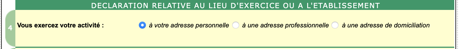 C’est l’adresse où tu vas recevoir tes courriers de création de l’entreprise et tes avis d’imposition professionnels. Le plus simple est généralement de le recevoir à domicile, mais tu peux mettre l’adresse de ton cabinet si tu préfères.