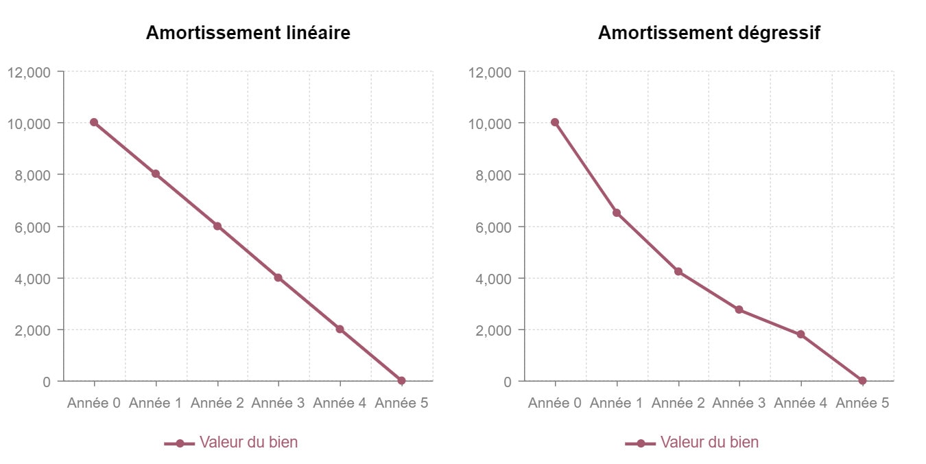 Comme son nom l’indique, l’amortissement dégressif diminue avec les années, les sommes à déduire sont donc de moins en moins élevées au fil du temps. Certains actifs peuvent bénéficier de cet amortissement :
