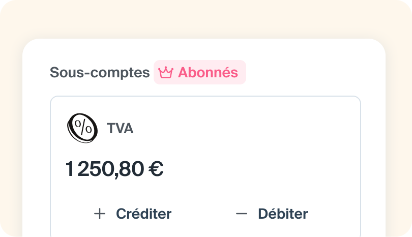 Ajoutez jusqu’à trois sous-comptes, chacun avec son propre IBAN, pour organiser plus facilement votre trésorerie. Séparez votre argent dédié aux taxes, aux cotisations ou à vos projets.