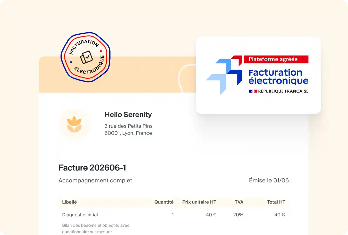 Indy est une plateforme agréée par l’État (ex-PDP). Cela vous assure une conformité native avec le format Factur-X. La facturation électronique est incluse sans surcoût dans notre module de facturation dédié. Activez-la en un clic depuis votre compte Indy.