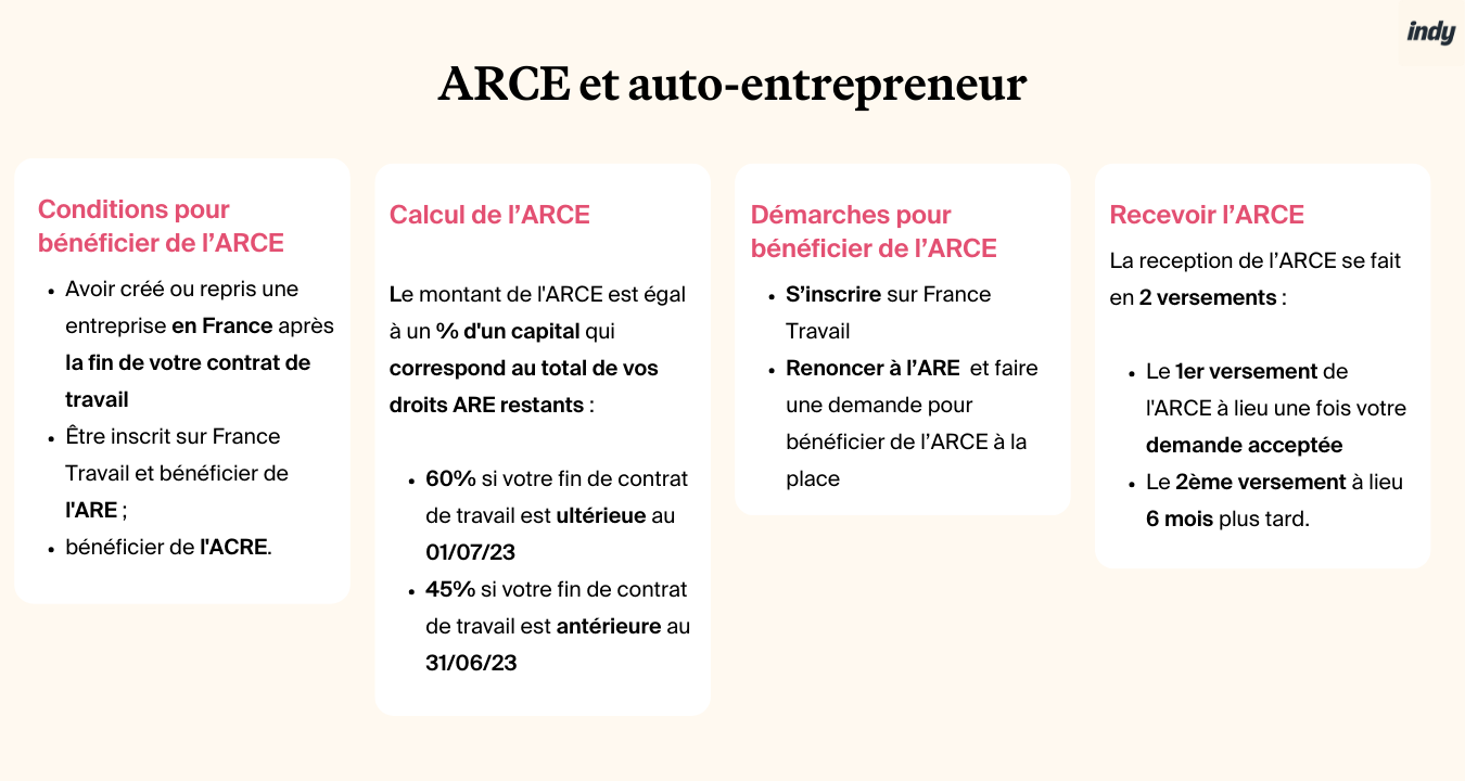 - Pour bénéficier de l’ARCE, vous devez avoir repris ou créer une entreprise, être inscrit sur France Travail, bénéficier de l’ARE, et de l’ACRE ;