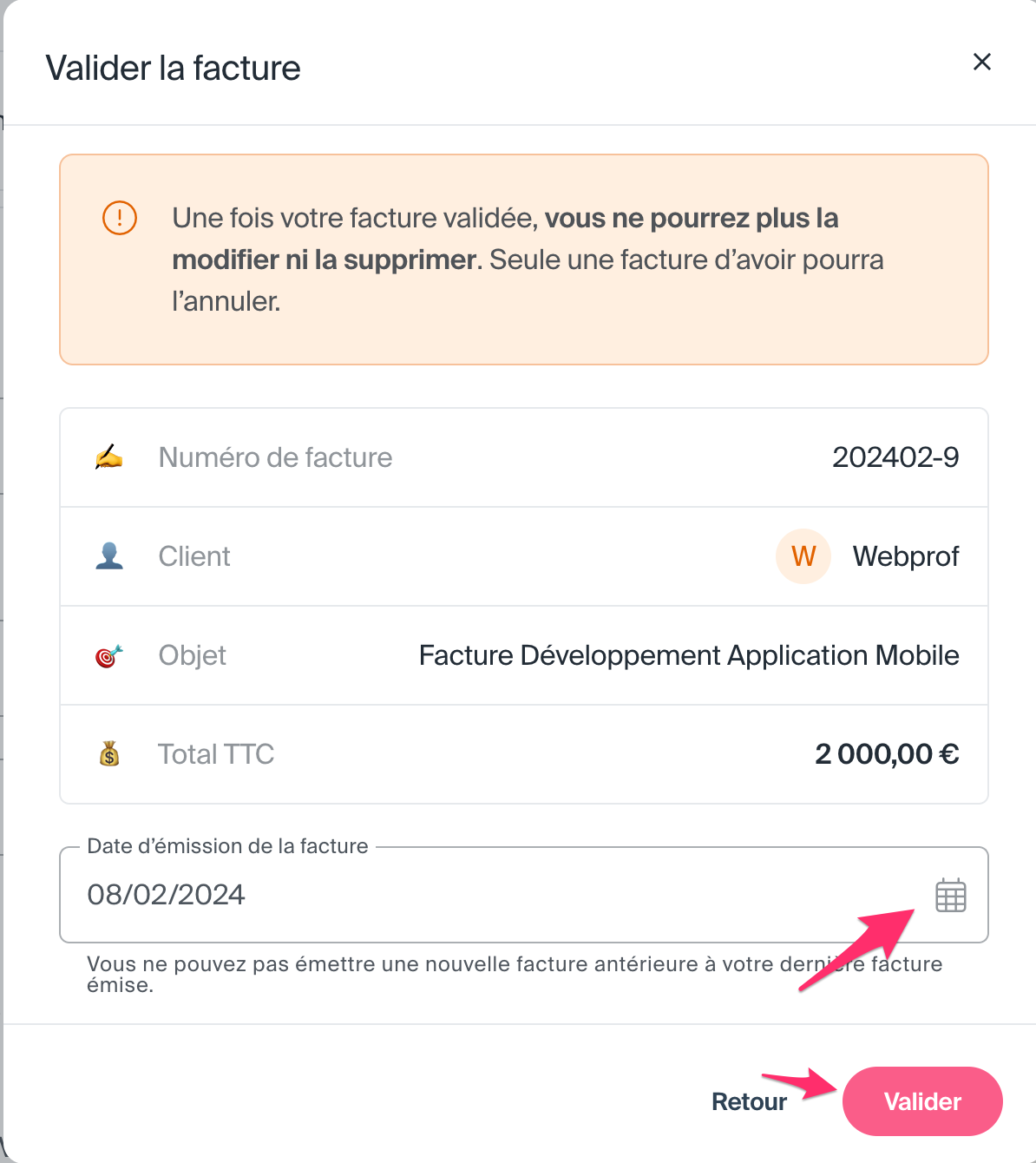 Une fois la facture terminée, vous pouvez soit l’enregistrer en brouillon soit la valider. Vous avez une facture conforme, que vous pouvez télécharger au format PDF ou envoyer directement par mail à votre client !🎉