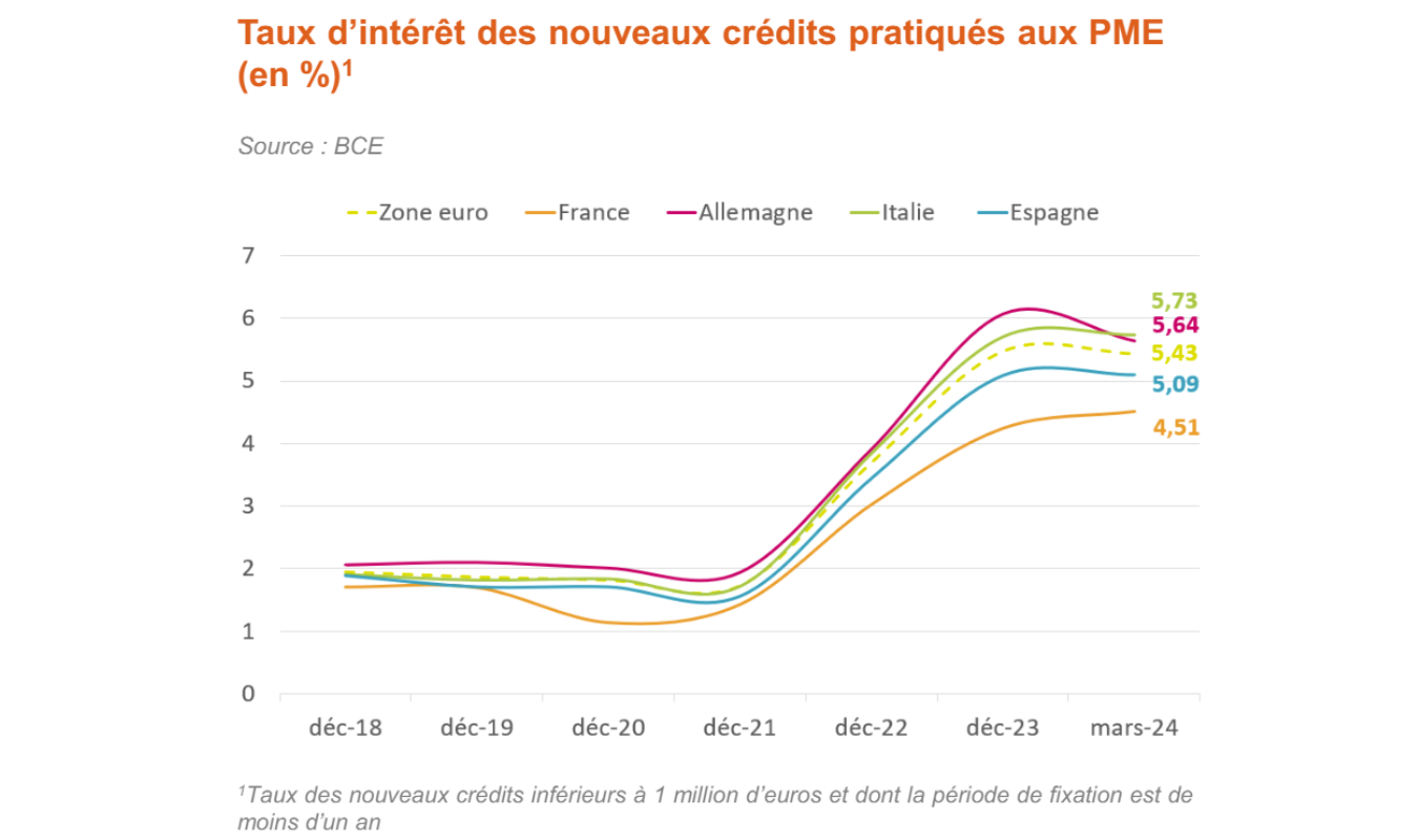 Tout d’abord, selon la Fédération Bancaire Française, le taux d’intérêt moyen pratiqué sur les prêts professionnels aux PME en France est de 4,51% en mars 2024. Comme nous pouvons le constater, ce dernier demeure nettement inférieur à d’autres pays de l’UE tels que l’Allemagne (5,64%), l’Italie (5,73%) ou encore l’Espagne (5,09%). En zone euro, le taux d’intérêt professionnel moyen s’élève à 5,43%.
