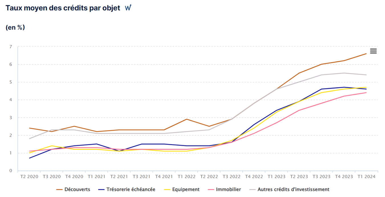Sur le site officiel de la Banque de France (BDF), les taux moyens des crédits accordés aux entreprises sont indiqués par objet. Ainsi, aux premiers trimestres 2024, les taux d’intérêt furent constatés :