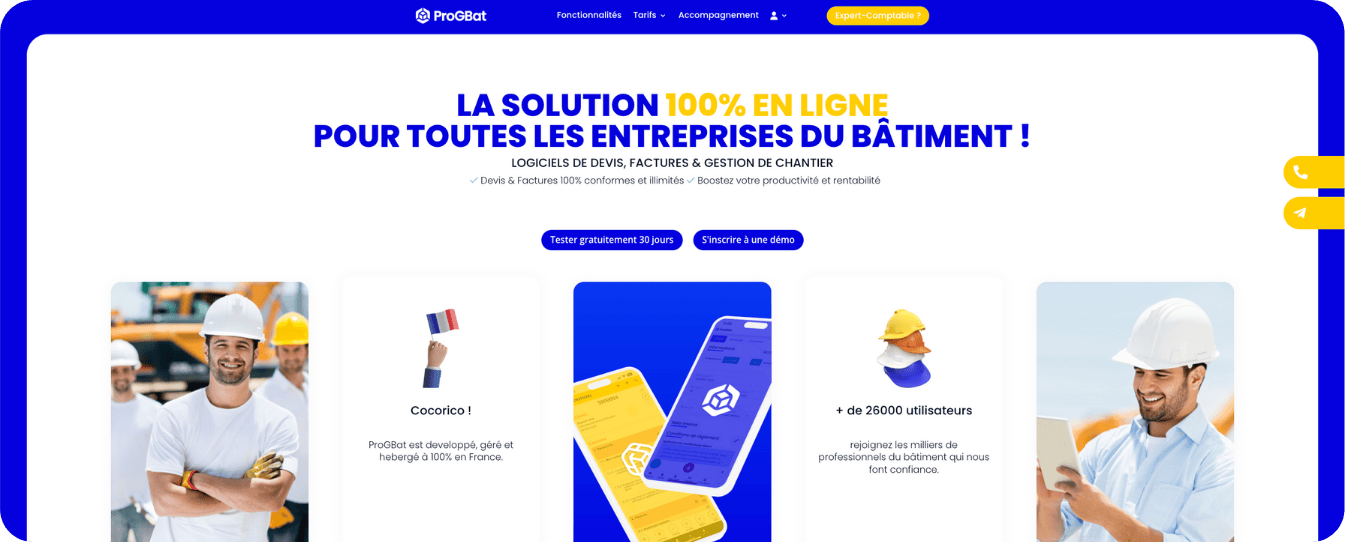 - ProGbat est un logiciel français de devis, factures et de suivi de chantier pour tous les entrepreneurs dans le BTP (à partir de 8 € HT/mois) ;