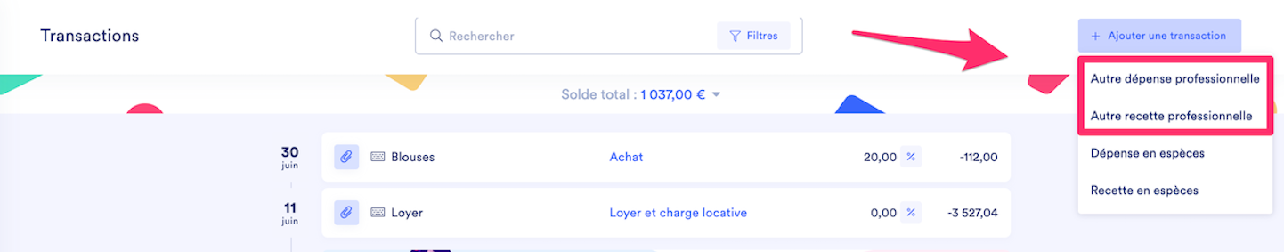 dans l’onglet « transaction » ne figurent pas les rubriques « autre dépense professionnelle » ni « autre recette professionnelle »