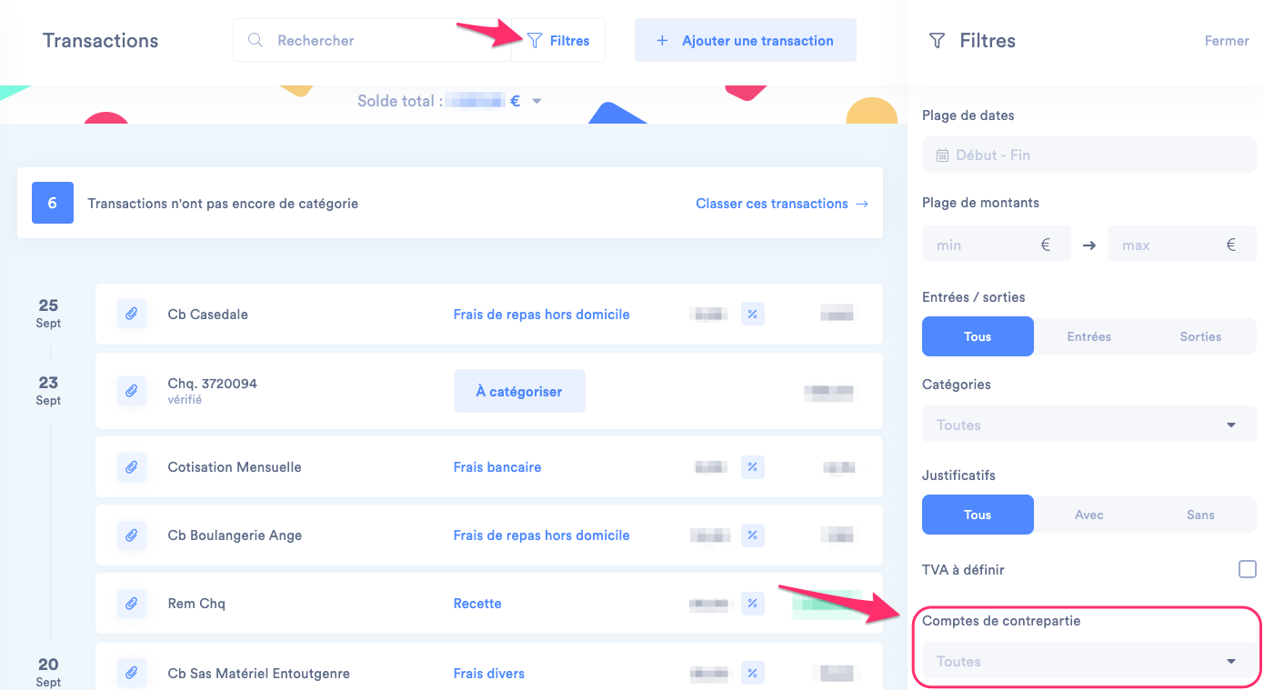 Pour retrouver toutes vos transactions manuelles, dans le même onglet cliquez sur Filtres puis dans Comptes de contrepartie choisissez transactions manuelles.