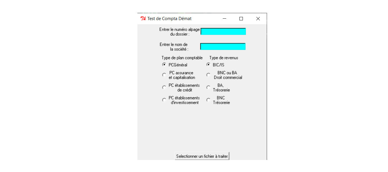 Double cliquez sur l’icône « TestComptaDemat ». La fenêtre suivante s’ouvrira alors :