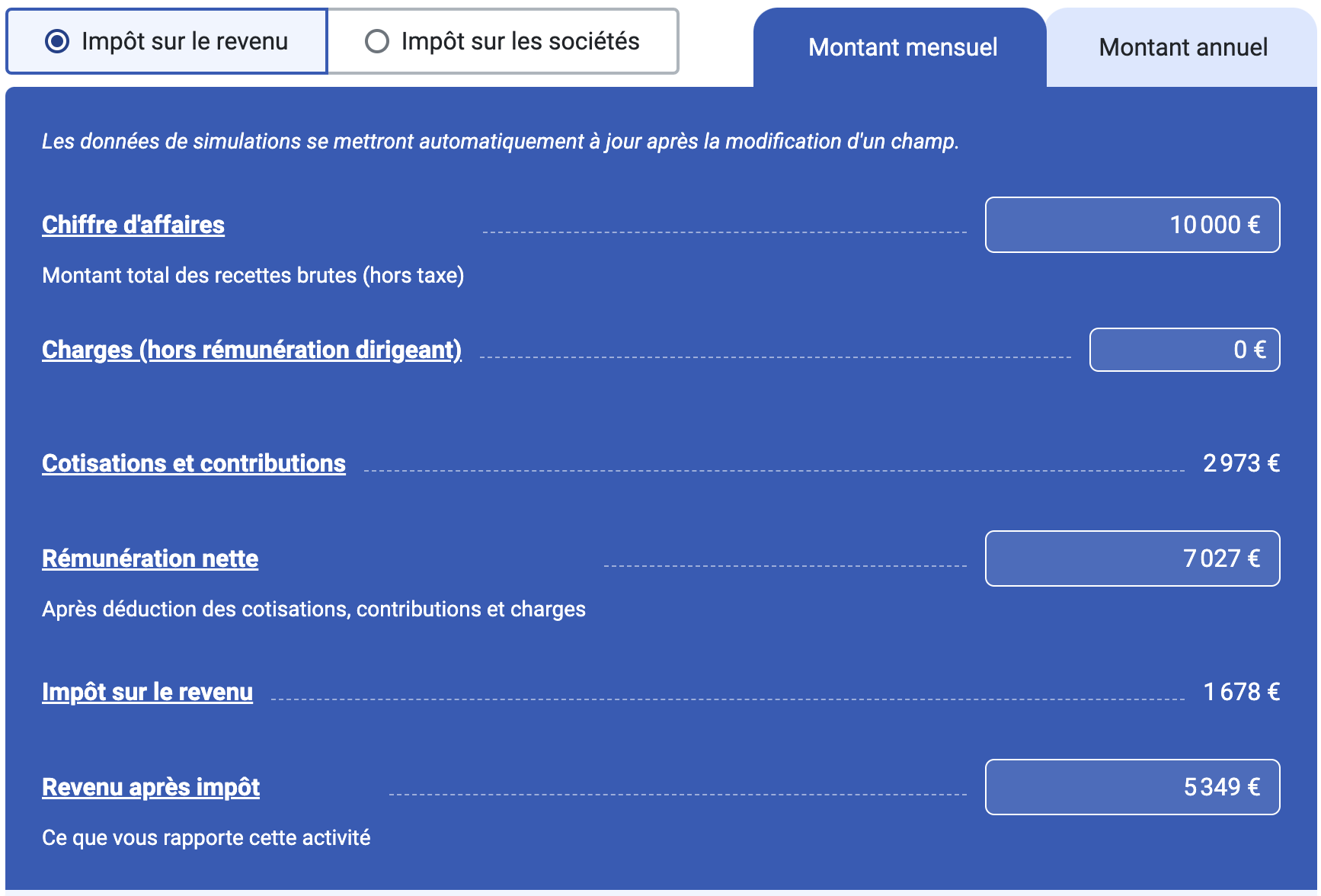 Par exemple, pour un entrepreneur individuel qui a un chiffre d’affaires annuel de 30 000 €, les cotisations sociales et contributions peuvent varier entre 7 000 € et 9 000 €, selon son activité et son régime fiscal.