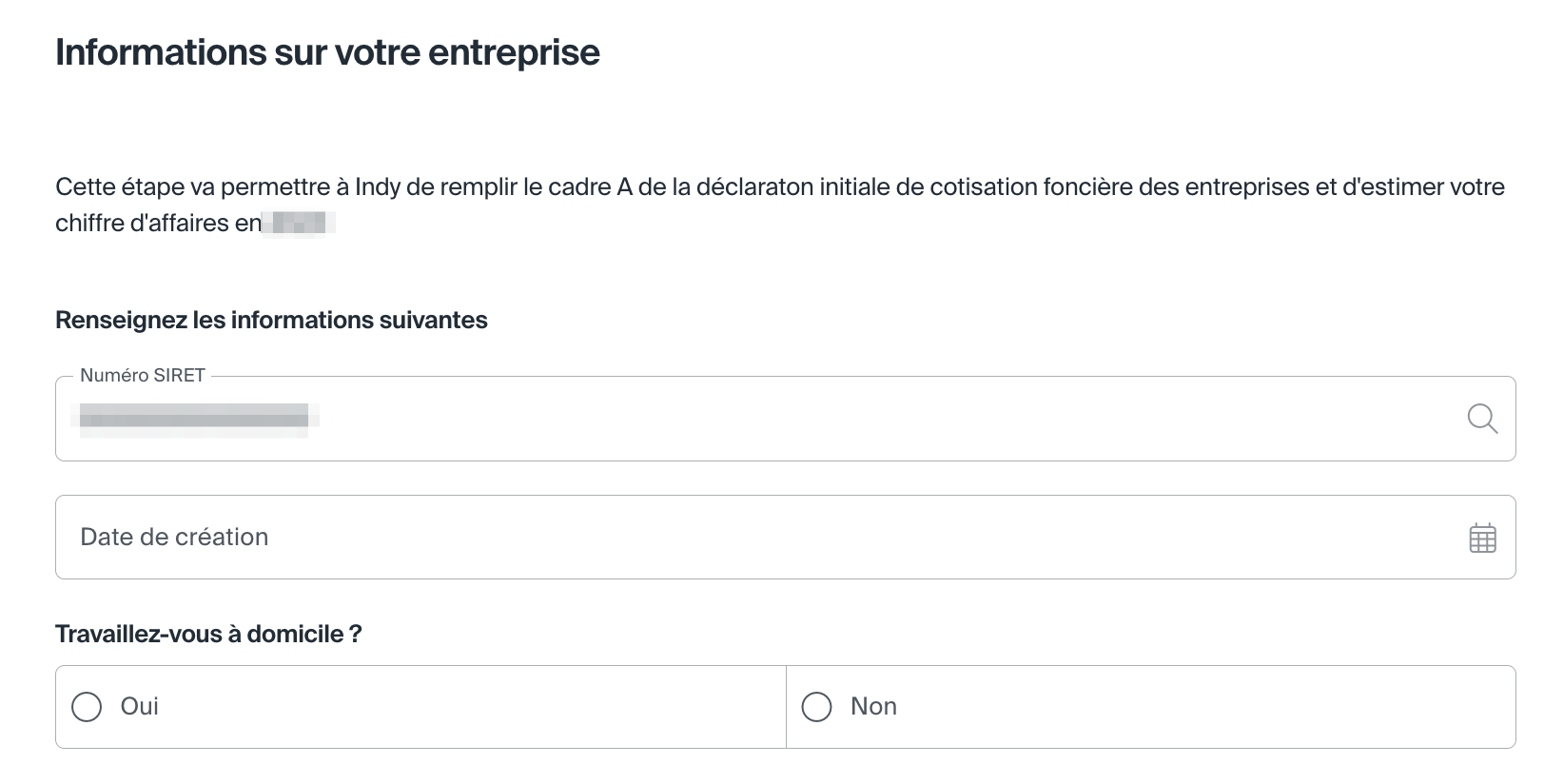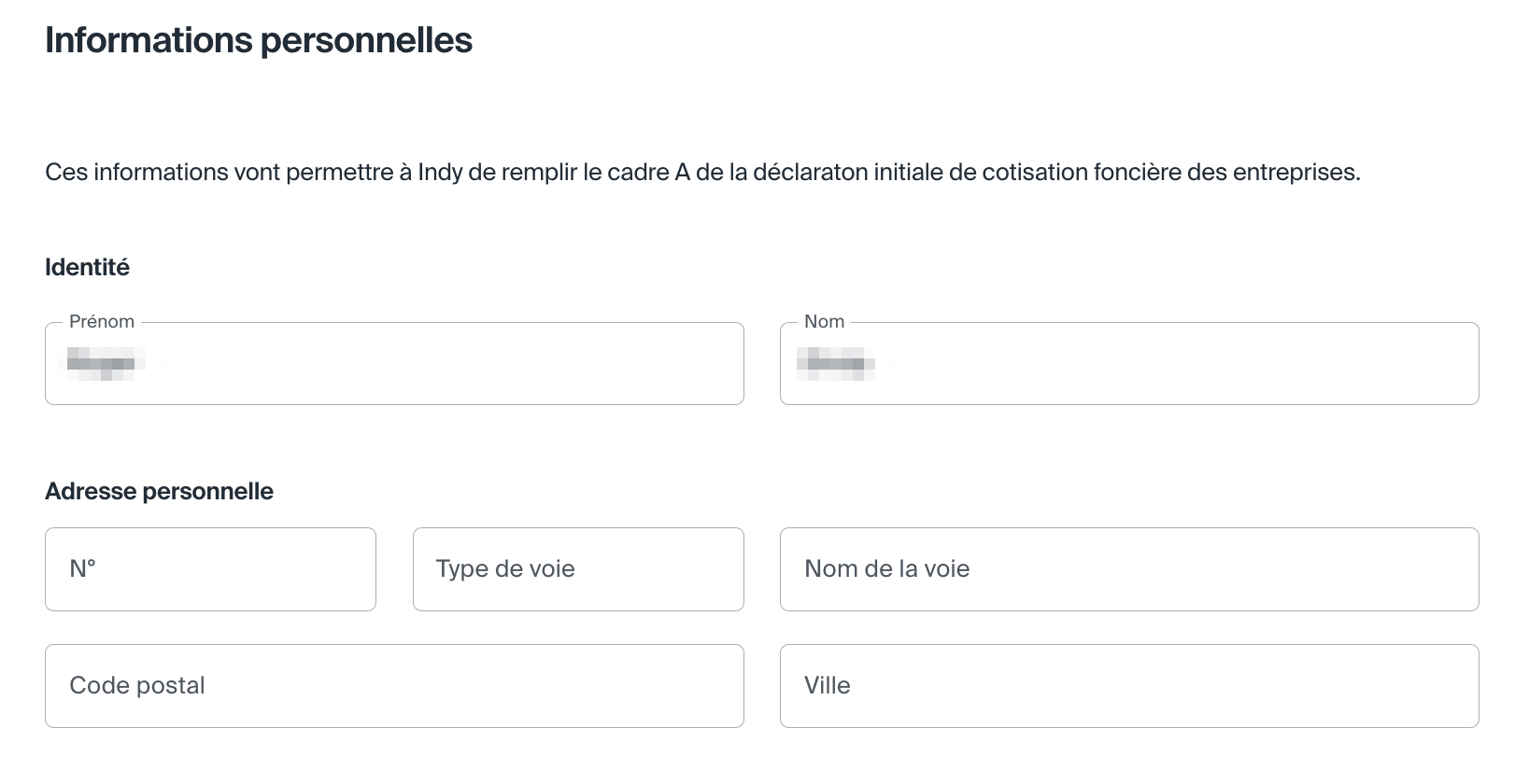 Pour toute personne qui s’inscrit avant la date limite de déclaration, Indy propose une aide au remplissage de la déclaration initiale. La déclaration se fait en 3 ou 4 étapes selon la profession et la forme juridique. Dans l’onglet “A faire” de Indy, sélectionner “Déclaration initiale de Cotisation Foncière des Entreprises”.