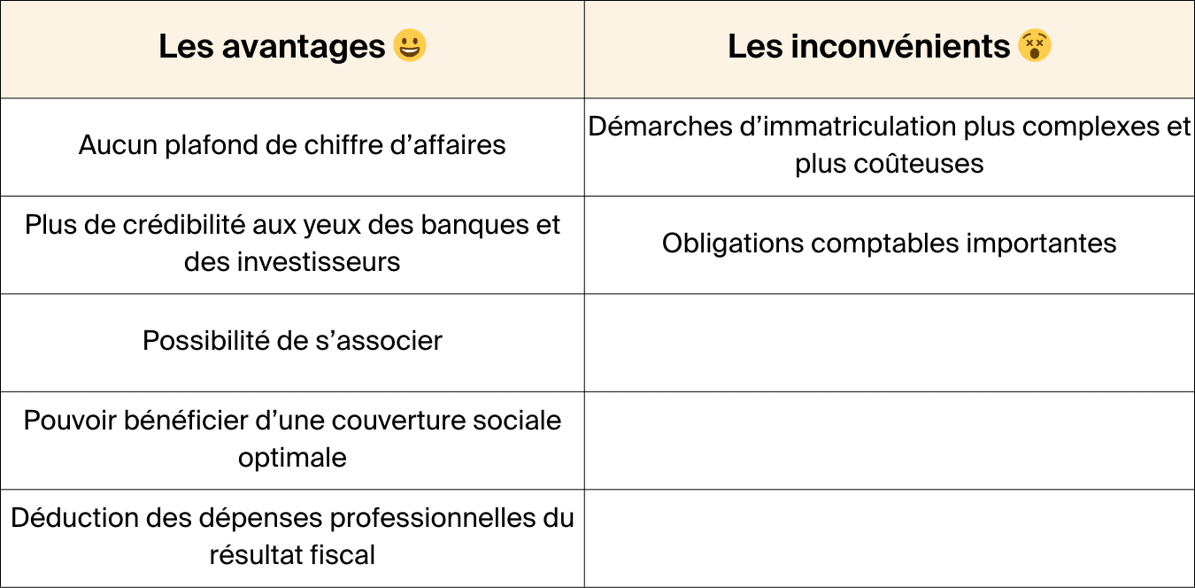 | Aucun plafond de chiffre d’affaires | Démarches d’immatriculation plus complexes et plus coûteuses |