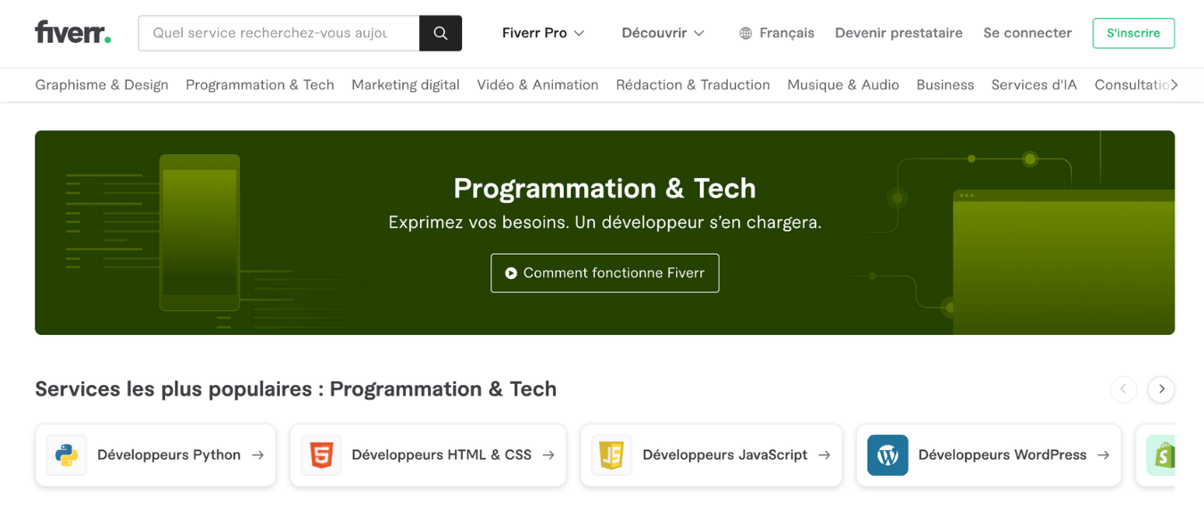Fiverr est aussi une plateforme internationale, mais dont l’interface est disponible en français. Pour les développeurs les offres sont classées entre plusieurs catégories :