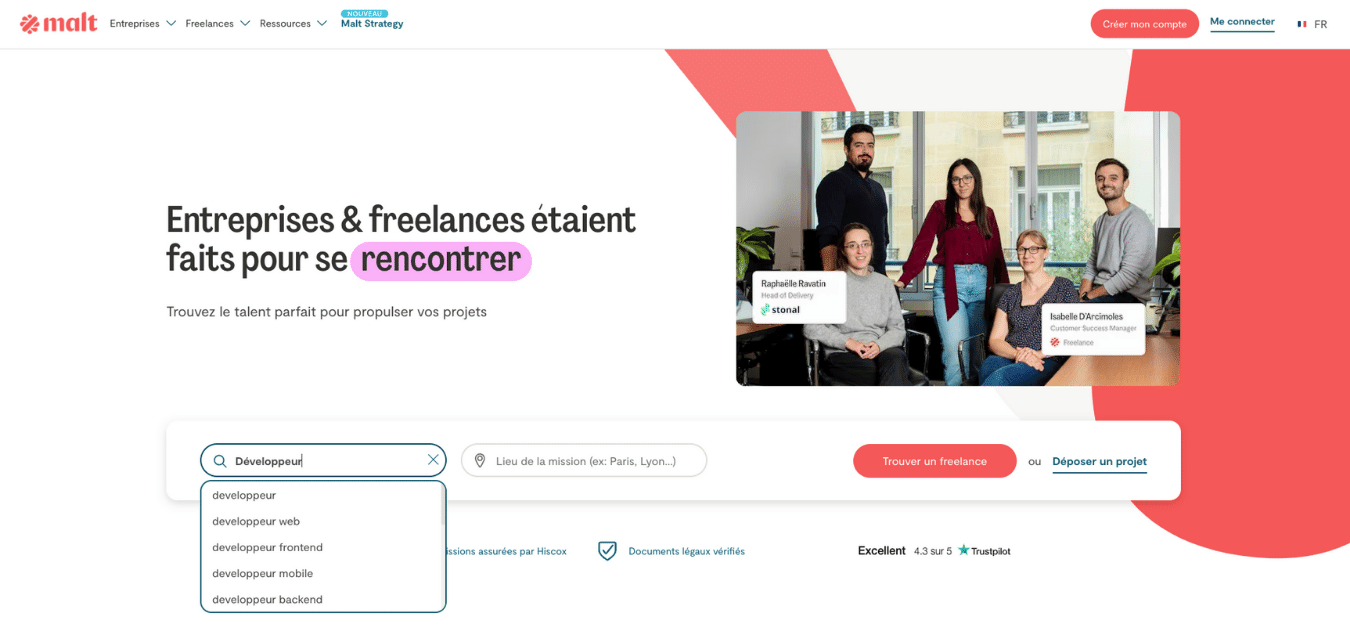 Malt c’est une des plateformes généraliste la plus utilisée par les freelances en France, tout secteur confondu. Certains considèrent Malt comme le meilleur site de freelance en France. Nous retrouvons sur la plateforme : des développeurs mais aussi des graphistes, des formateurs, des professions administratives, des professionnels de la finance… Les profils sont très divers. La plateforme permet de rapprocher les freelances et les entreprises, partout en France et en Europe. Elle n’est pas ouverte aux particuliers qui recherchent des freelance.