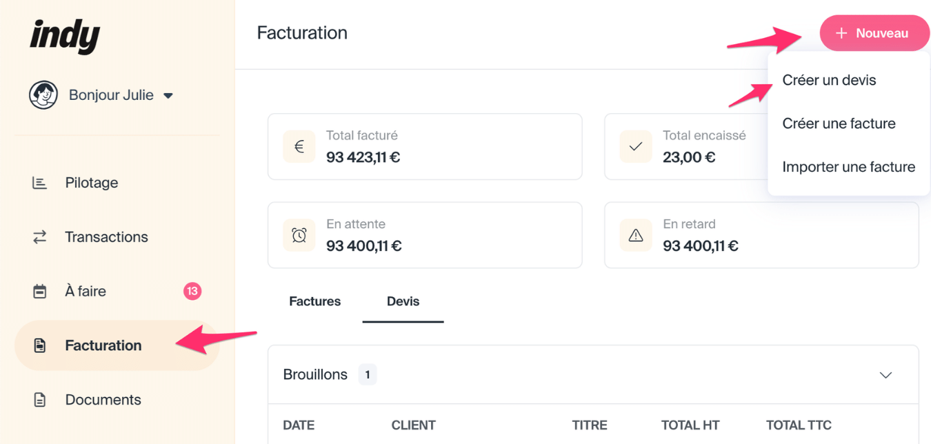 Indy propose un module facturation 100% gratuit et facile d’utilisation. Ce dernier vous permet aussi bien de réaliser des factures mais également des devis. Voici un petit tutoriel de la fonctionnalité devis 😉