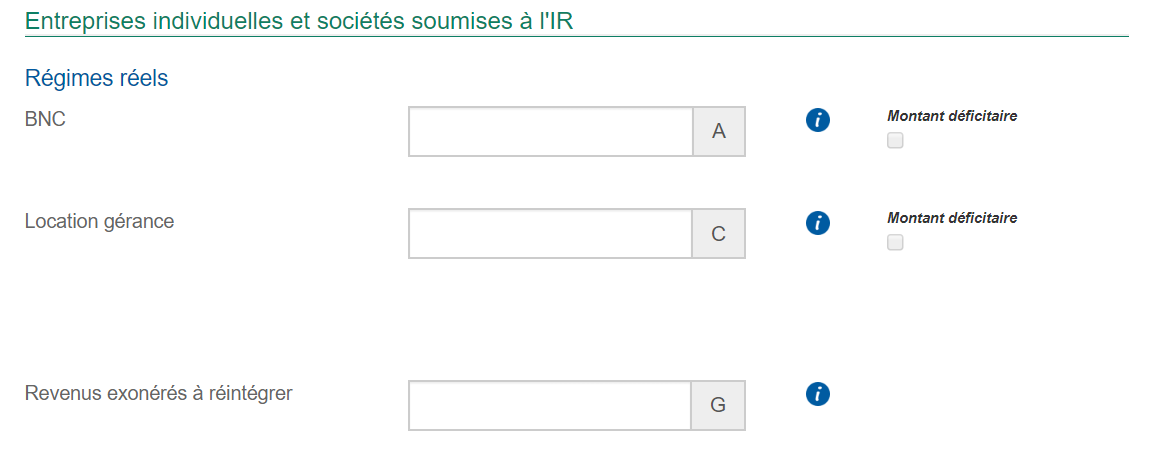 - Cadre A : Pour les BNC, indiquez votre bénéfice (ligne 46 de la déclaration 2035 B) ou votre déficit (ligne 47 de la 2035 B) en cochant “Montant déficitaire”. Si vous exercez plusieurs activités soumises au régime BNC, vous devez cumuler vos revenus.