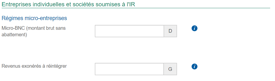 - Cadre G : Si vous en avez, notez les revenus exonérés à réintégrer, c’est-à-dire l’exonération ZFU ou ZRR (cadre CS ou AW, ligne 43 de la 2035 B), l’exonération “Médecin pour la permanence des soins” (cadre CI de la 2035 B) et la plus-value à court terme exonérée (page 3 de la 2035 S). Si vous êtes micro-BNC et que vous avez bénéficié d’un abattement ZFU ou ZRR sur vos recettes, alors il faut annuler cet abattement ici en renseignant 66% de vos recettes exonérées dans cette case. Par contre, les 34% d’abattement fiscal auxquels tous les micro-BNC ont droit ne doivent pas apparaître ici.