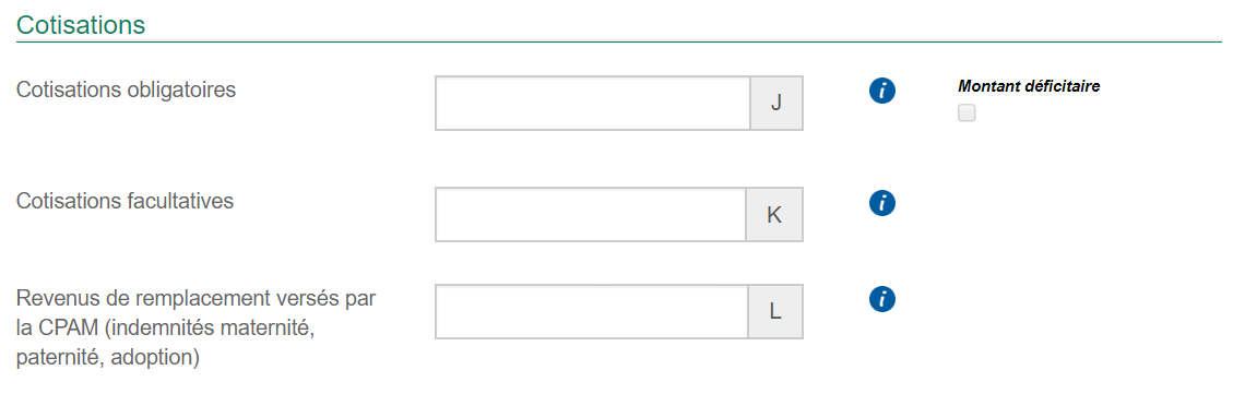 De plus pour la case J (cotisations sociales) , j’avais reçu un échéancier avec 34E pour les allocations familiales, 1E pour cotisation d’assurance maladie, 0E de contribution additionnelle maladie et 126E pour CSG/CRDS. Dois je noter dans la case J les 35E (allocations familiales + cotisation d’assurance maladie)? ou dois je mettre zéro dans cette case?