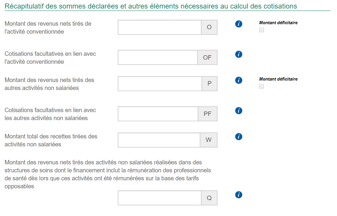 - Cadre O : Pour tous, indiquez le total des revenus conventionnés nets (avec abattement de 34% pour les micro-BNC donc). Il s’agit des honoraires tirés d’actes remboursables (y compris les dépassements d’honoraires), les honoraires issus de rétrocessions d’actes remboursables (pour les remplaçants) et toutes les rémunérations forfaitaires de l’assurance maladie (aide à la télétransmission, prime d’installation, indemnisation, aides Covid imposables, etc.). L’URSSAF donne comme formule pour la case O : (A ou 66% de D + G) x (recettes conventionnées / total des recettes cadre W). Si vous déclarez un déficit, cochez la case “Montant déficitaire”.