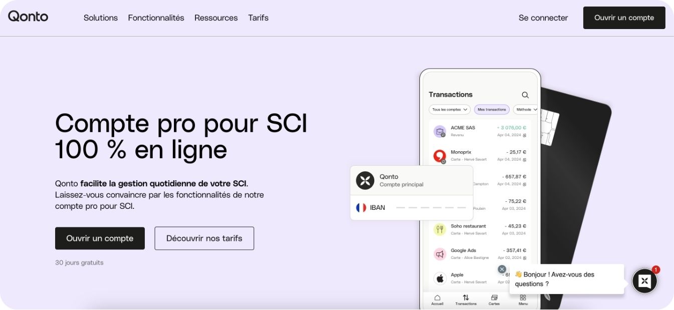 Fondée en 2016, la néobanque française Qonto, propose une offre de compte pro en ligne à destination des SCI. Ici vous avez le choix entre 3 offres :